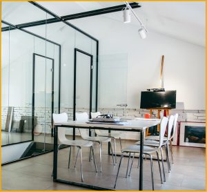 I componenti modulabili permettono di configurare pareti che separano gli spazi senza sacrificare la luminosità, mantengono elevati standard di comfort acustico (grazie a guarnizioni dedicate), si integrano perfettamente con porte in vetro a battente o sistemi scorrevoli della stessa collezione.
